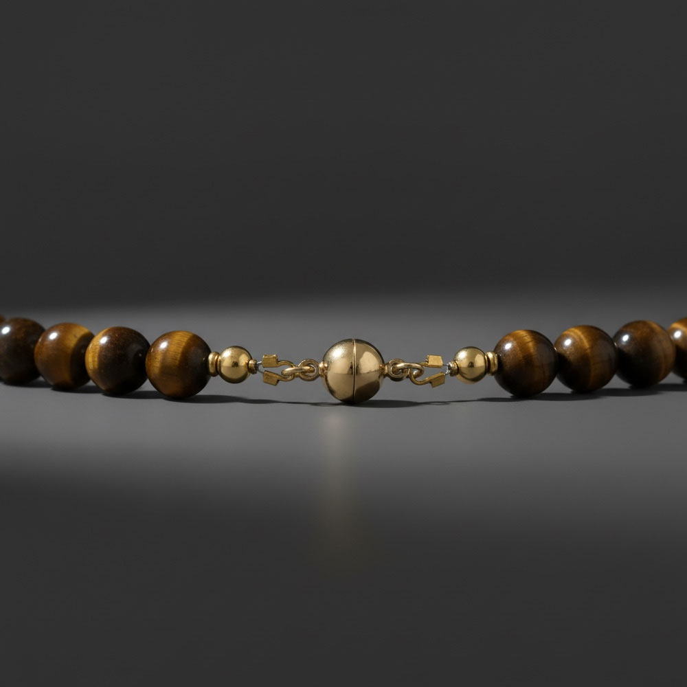 Amber Pearl necklace features a harmonious blend of natural gemstones and elegant accents. Tiger skin Jasper and Tigers eye gemstones add earthy tones and unique patterns, enhancing the necklace’s visual interest. Tarnish-resistant gold-plated spacer beads provide a touch of luxury and ensure lasting shine. The necklace is finished with a tarnish-resistant magnetic clasp for easy, secure wear.