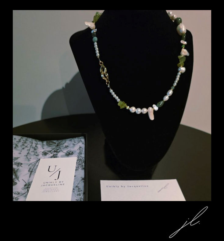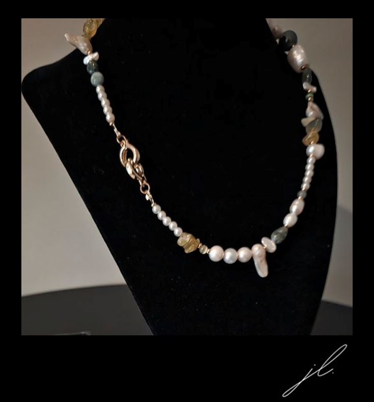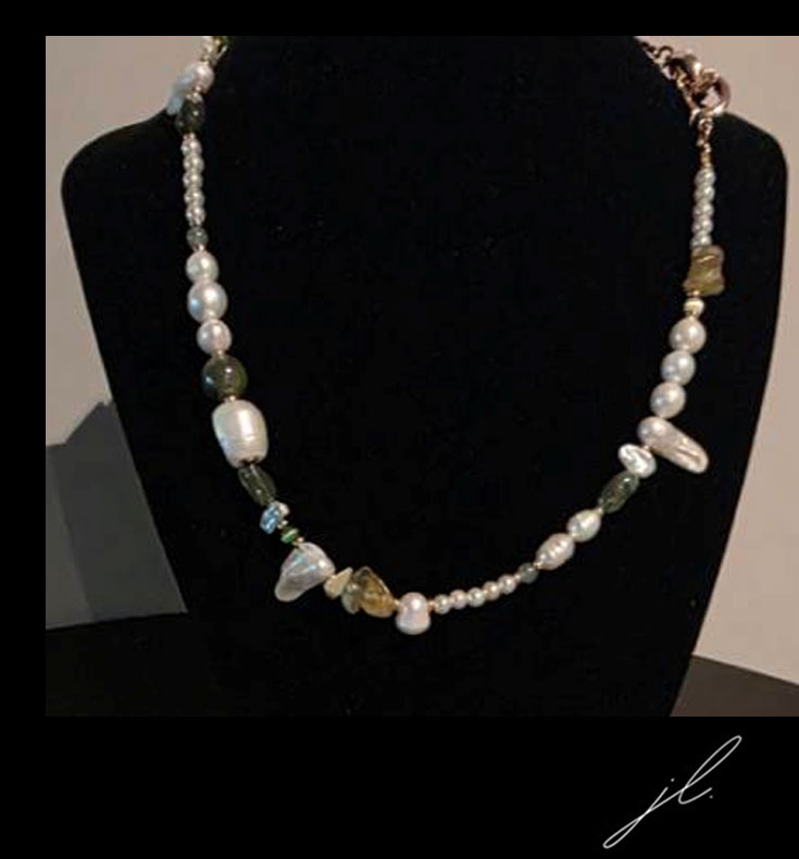Each item is handcrafted providing unique charm and authenticity using natural gemstones, semi-precious stones, freshwater pearls and tarnish resistant findings. A modern heirloom for you to wear and cherish we advise you remove your necklace before going to bed, taking a shower or participating in physical activity. Avoid contact with any creams, perfume, deodorant, water or harsh chemicals.
