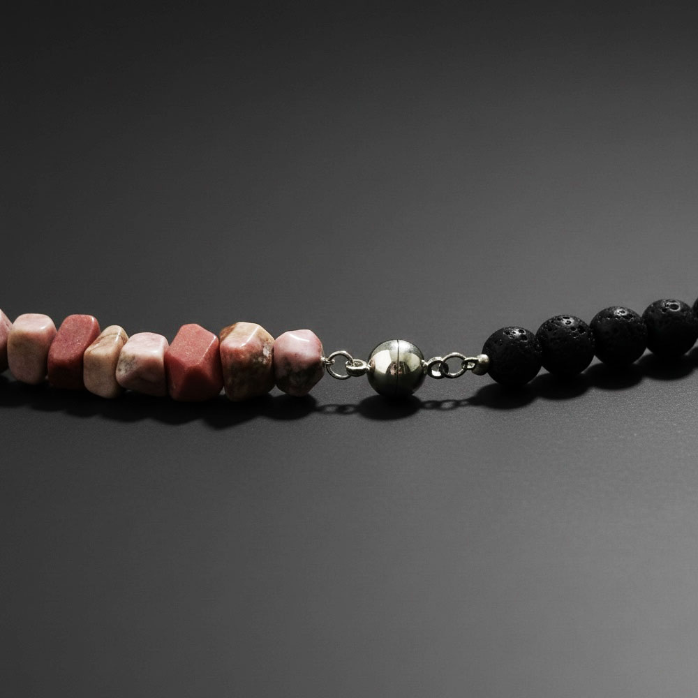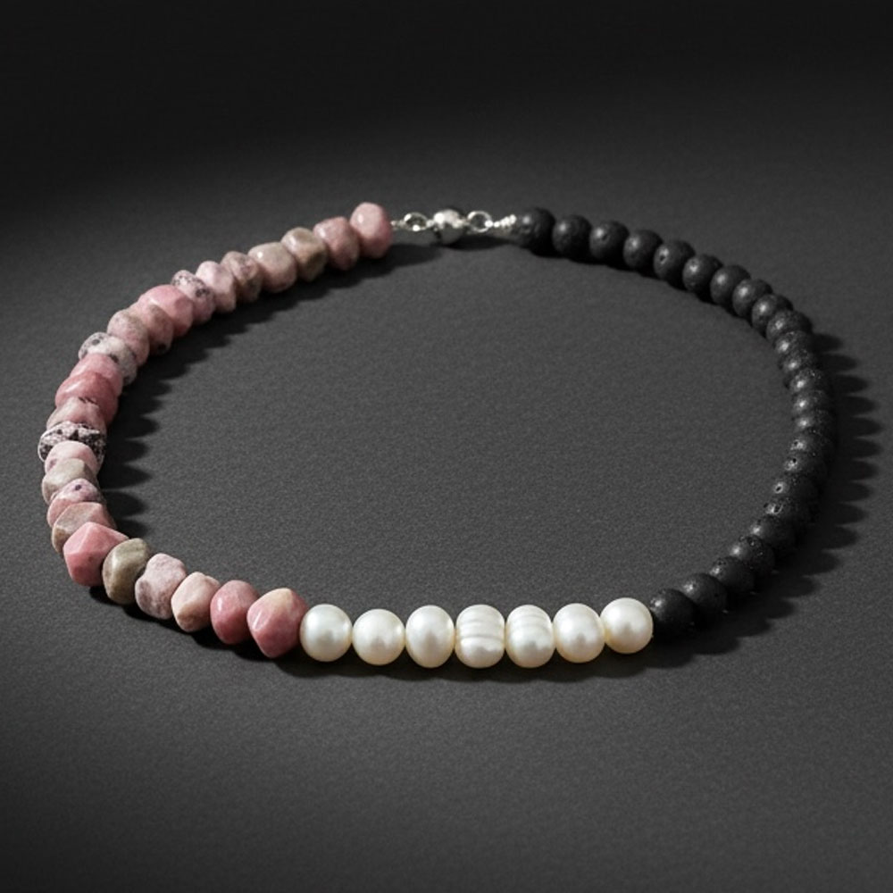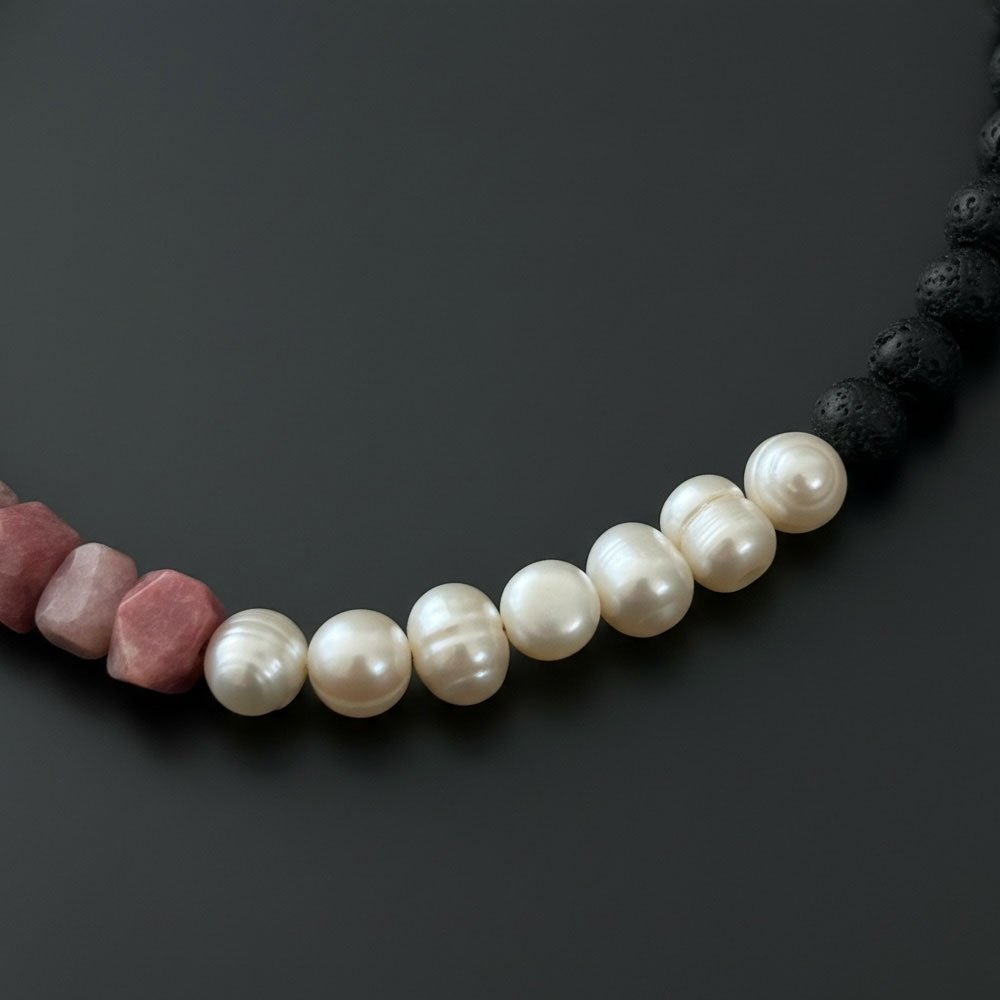 Inca Rose Necklace is a striking composition of contrast and balance, combining matte black lava stone, luminous freshwater pearls, and soft pink rhodonite. The earthy texture of lava beads grounds the design, while a refined section of pearls adds quiet elegance and a touch of light. Rhodonite introduces warmth and subtle colour variation, creating a necklace that feels both contemporary and expressive. Lava stone is naturally porous and has long been associated with grounding and sensory qualities, adding an understated layer of meaning to this distinctive piece. Designed as a statement necklace, Inca Rose is handcrafted to be worn with confidence — a modern interpretation of pearl jewelry with depth and individuality.