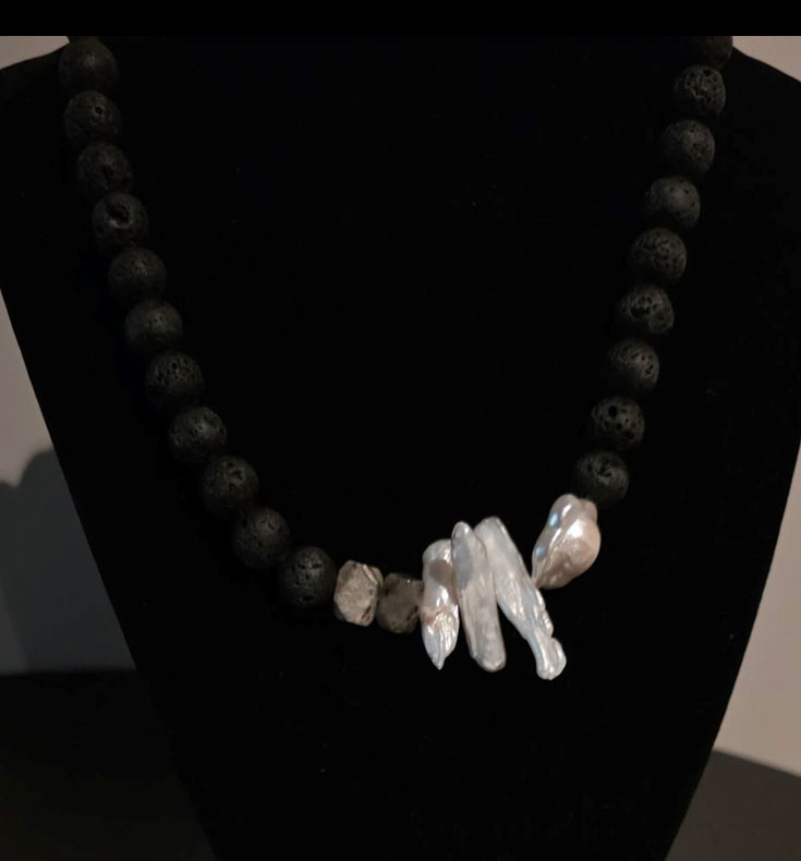 Zahra Necklace — Named after the Arabic word for “flower,” is a modern statement piece — with an edgy twist. This natural stone necklace combines black lava stone, nucleated flower pearls, and rhodonite rondelles, creating a fresh, unique design. Due to the porous nature of lava beads they can absorb essential oils and perfumes with the added benefit of aromatherapy while wearing the necklace. Simply add a few drops of your favorite oil or perfume.
